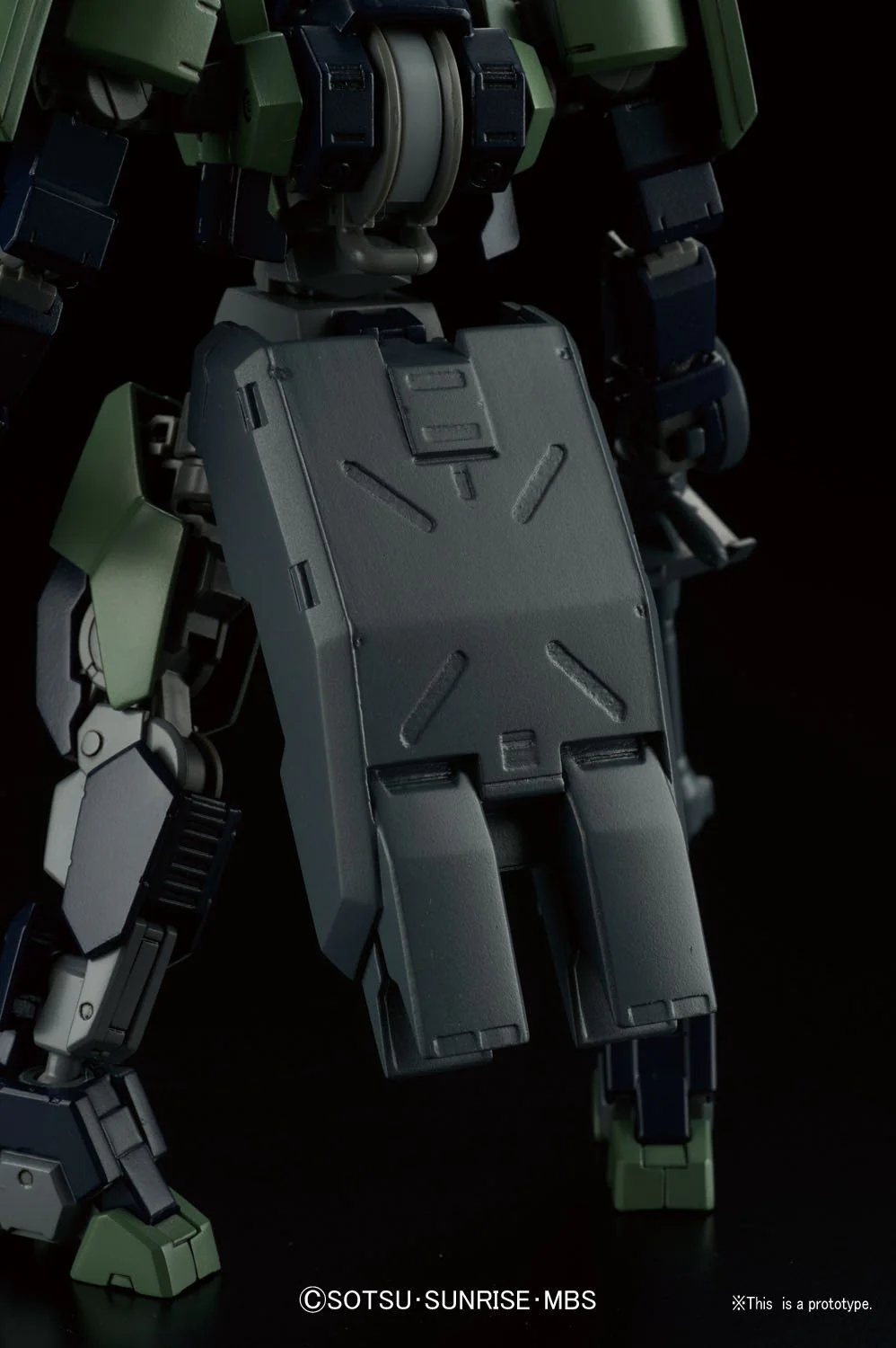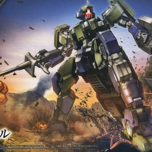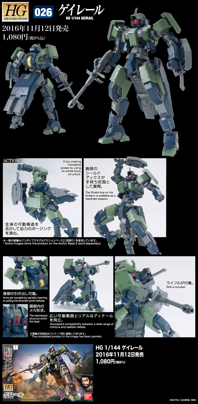 The predecessor to the Graze, the Geirail appears in season 2 of “Gundam Iron-Blooded Orphans.” Includes rifle, axe, and hover unit that can be attached to the back of the suit. Runner x4, Sticker x1.
