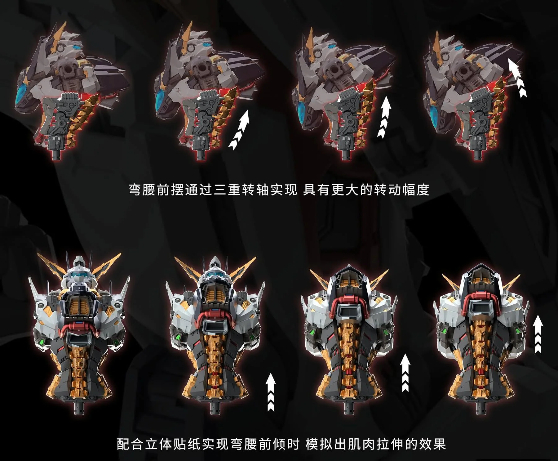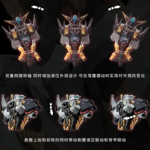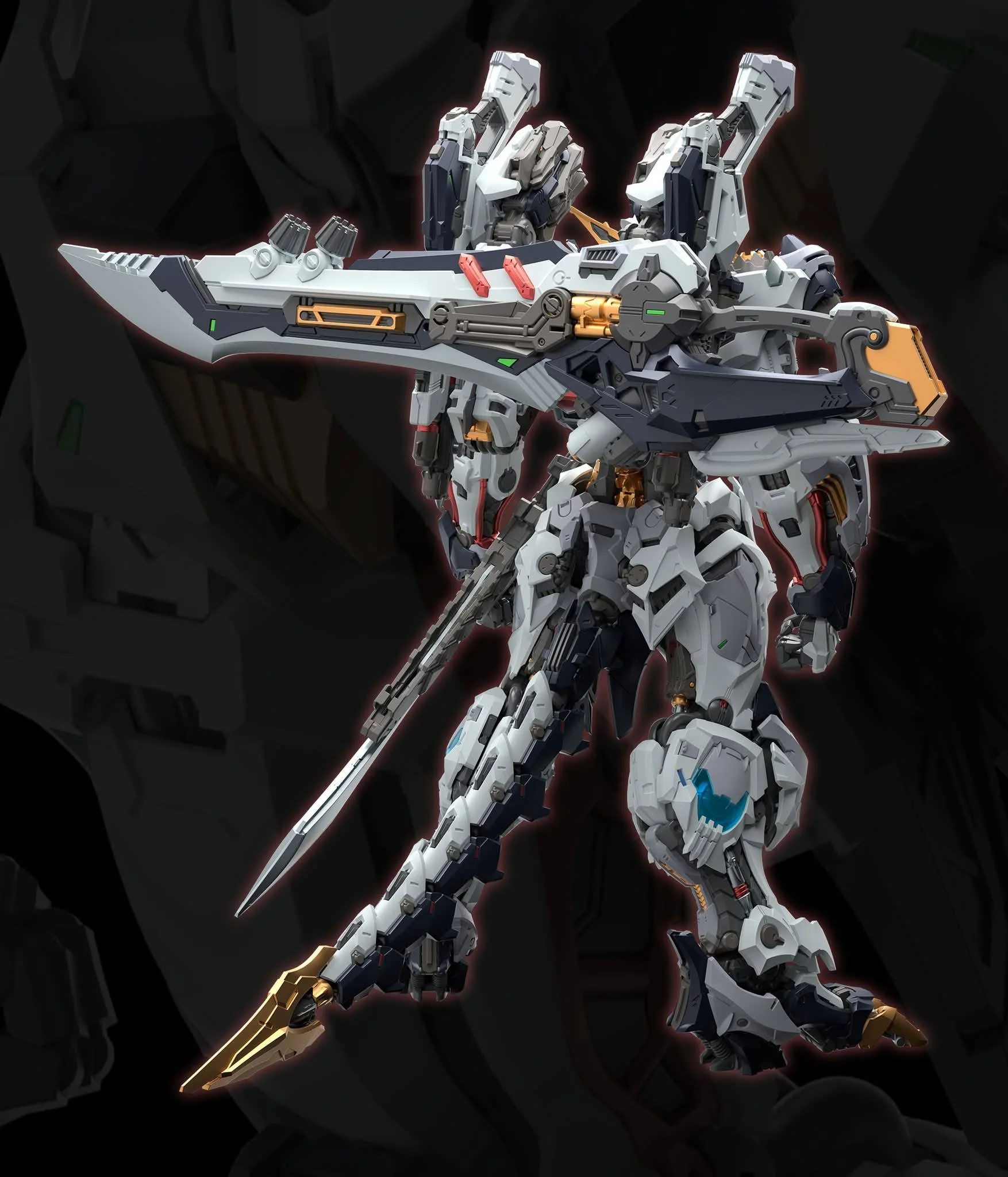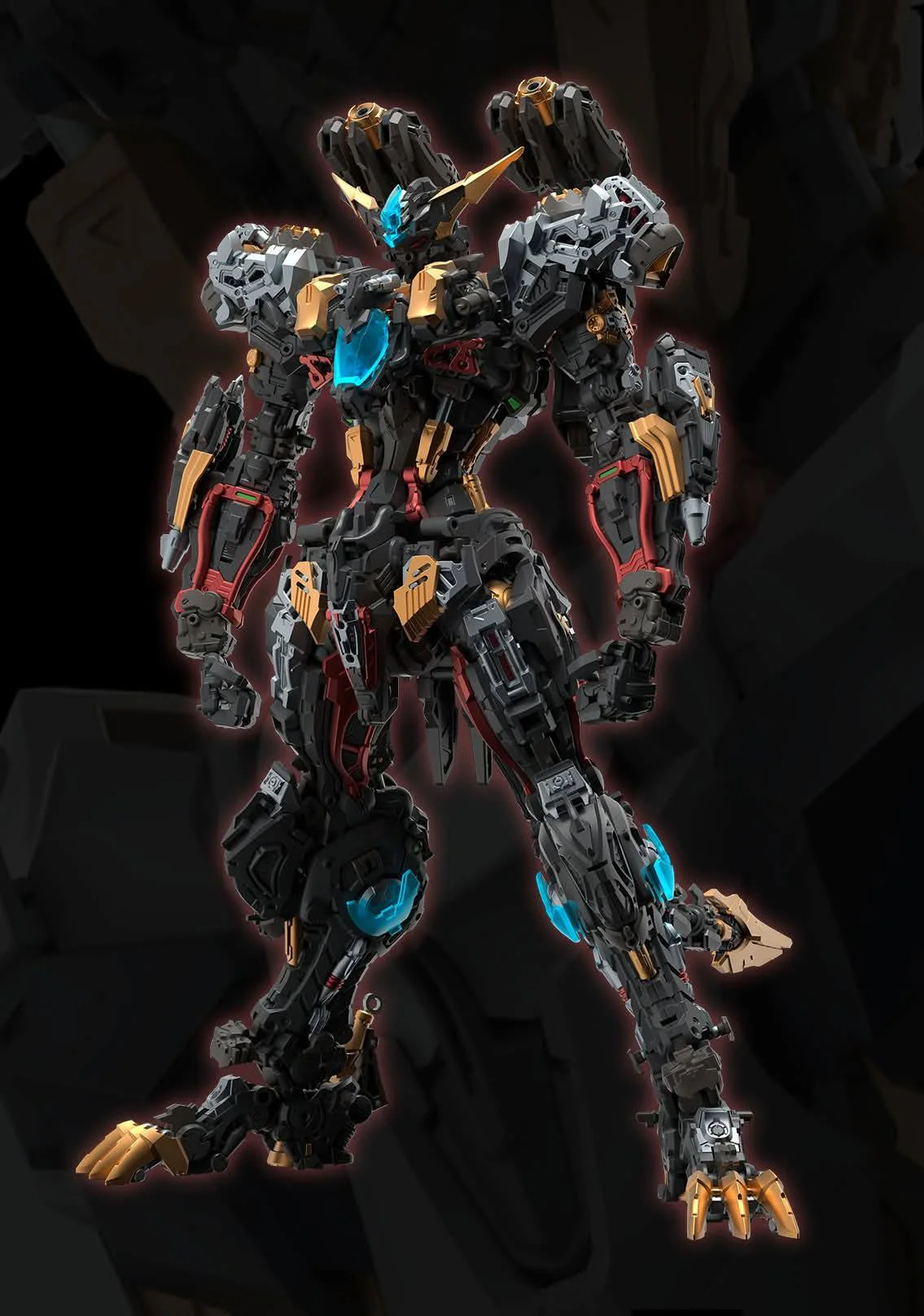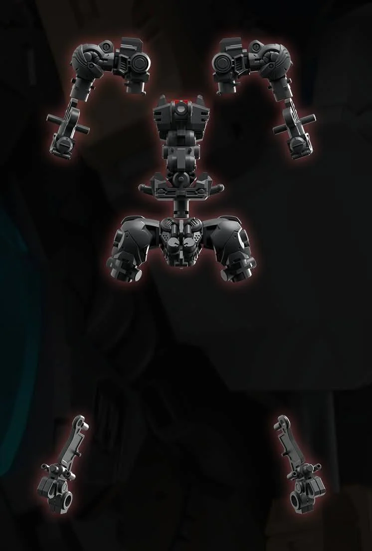 The extensive panel lines, vents, and mechanical surface detailing are molded directly into parts. The large rear-mounted unit with multiple thruster-like components integrated into its silhouette. Thick leg construction and large feet are designed to visually support the upper body mass.