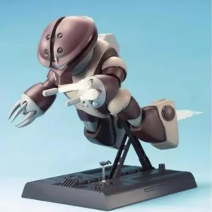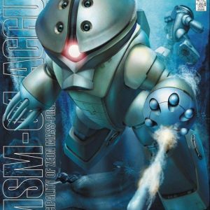 A brand-new MG frame was designed for this unique mobile suit, over which you install the “armor” parts; the joints all feature polycaps and are superbly designed, so that the Acguy can take on just about any pose you’ve seen it take in the series, including the cute curled-up crouch with its arms around its knees! A one-touch spring switch will release the claws on the right “hand”, causing them to pop out quite menacingly! Two sets of “effect parts” are included, too — one features missiles coming out of the Acguy’s left “hand”, and the other portrays the aquatic jet-streams from the thrusters under the Acguy’s feet.